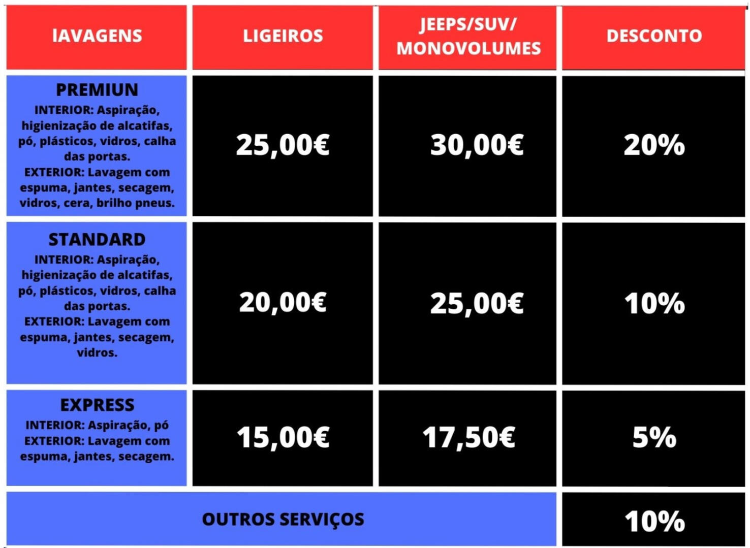 | Lavagem Express (Interior: Aspiração e pó. Exterior: Lavagem com espuma, jantes e secagem) | 15€ | 17,50€ |